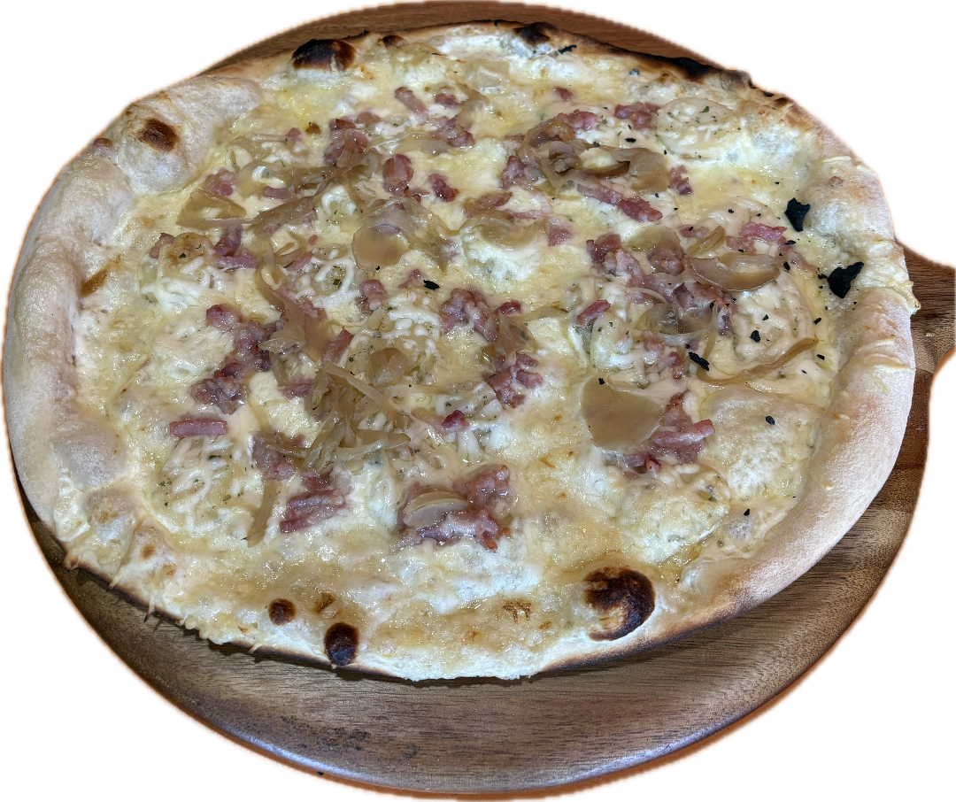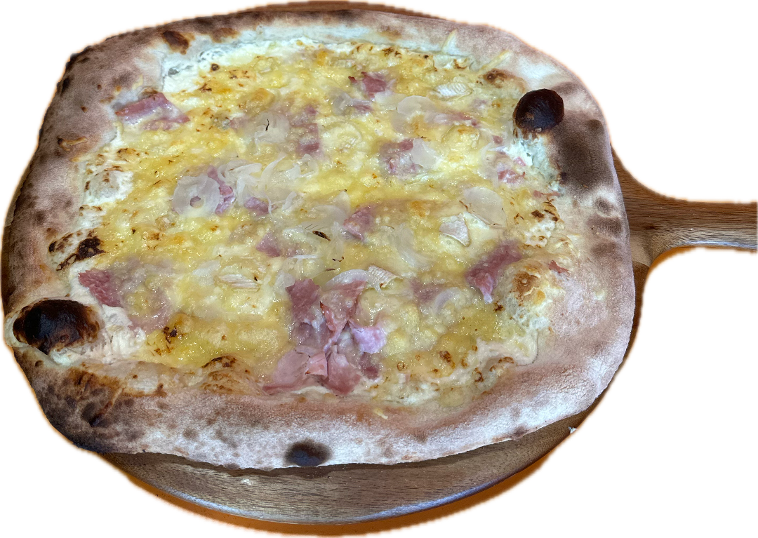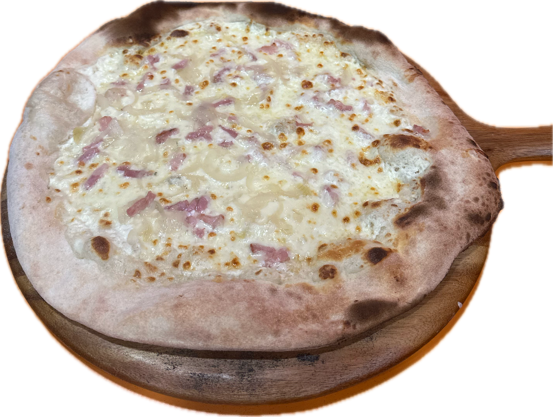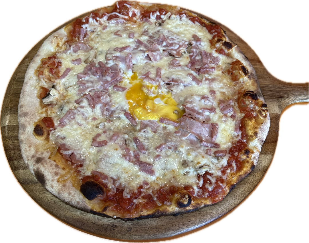 sauce tomate, emmental, épaule, champignons frais, lardons, crème, oeuf