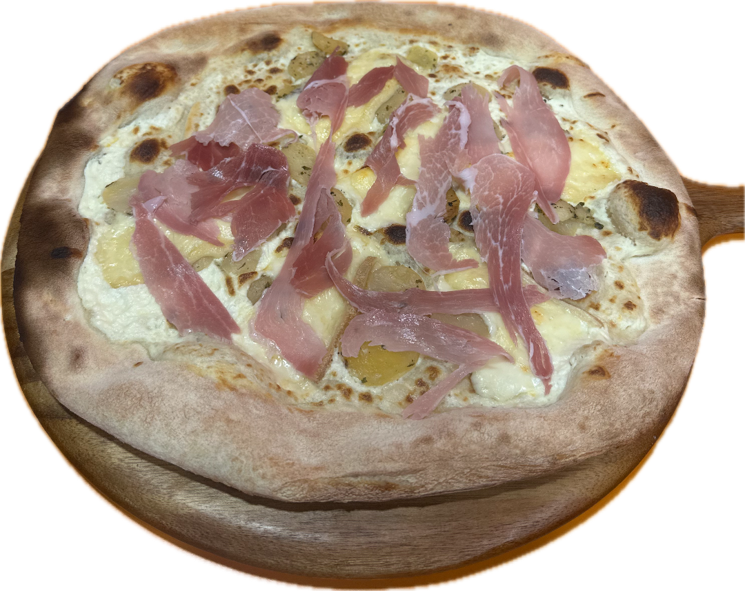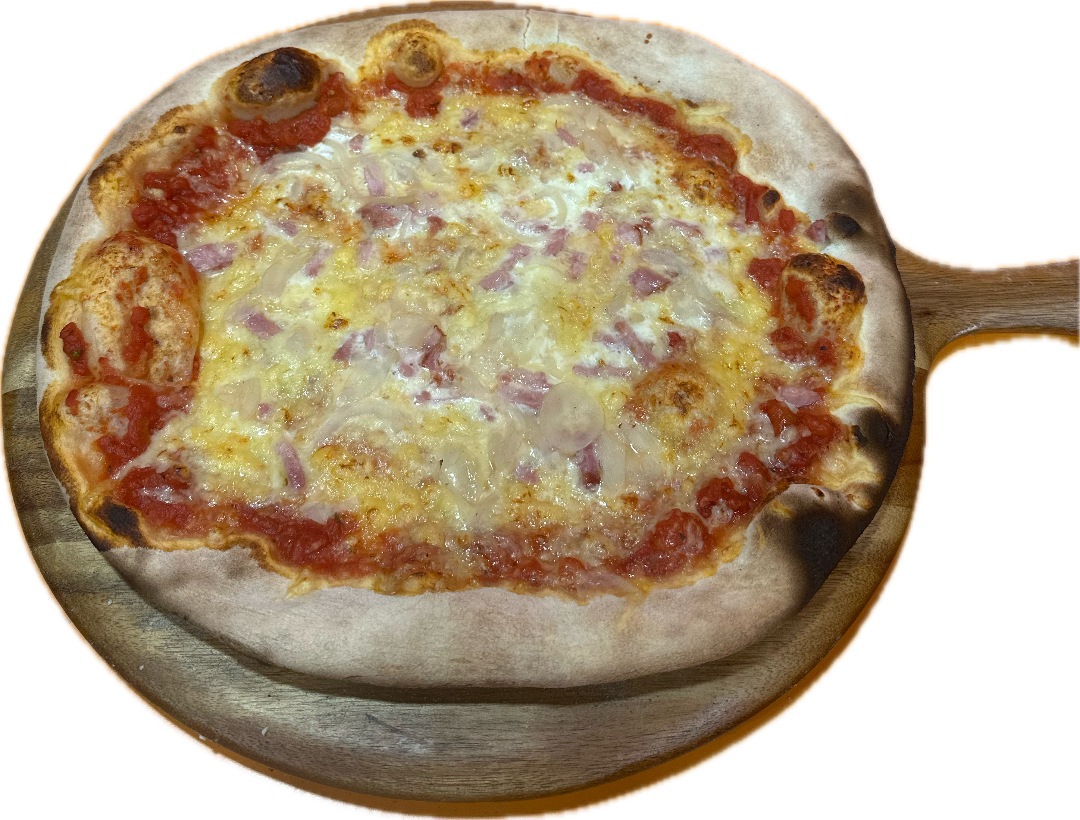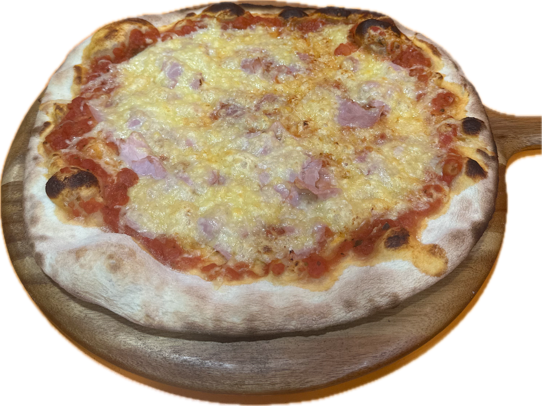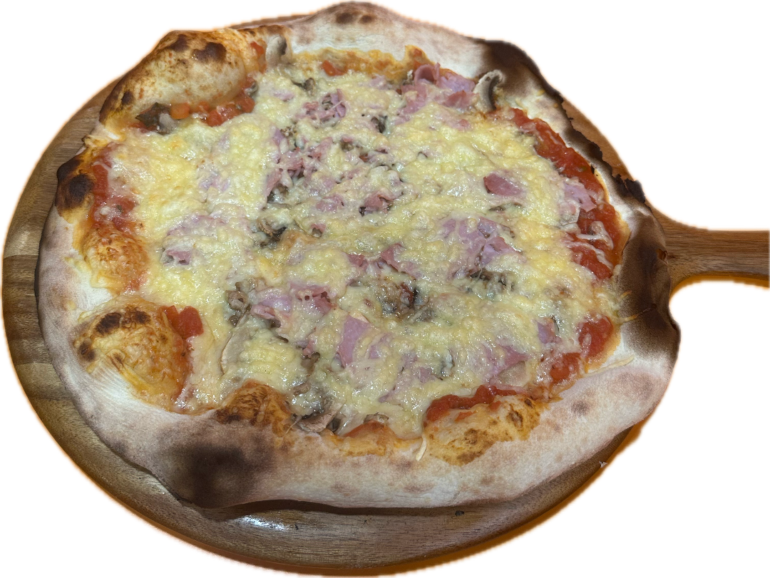 sauce tomate, emmental, épaule, champignons frais, lardons, crème, oeuf