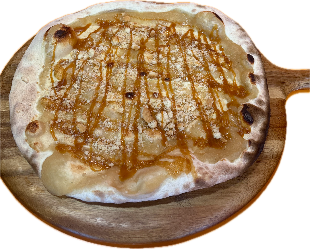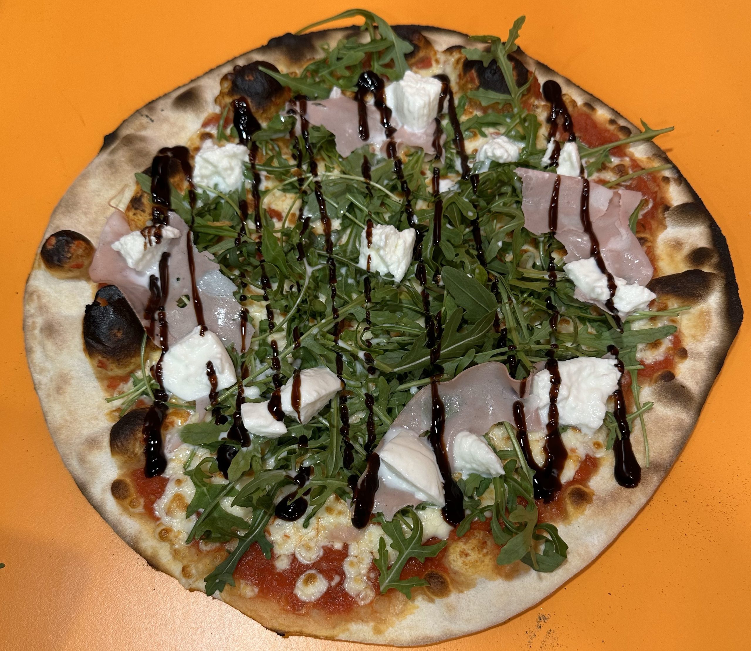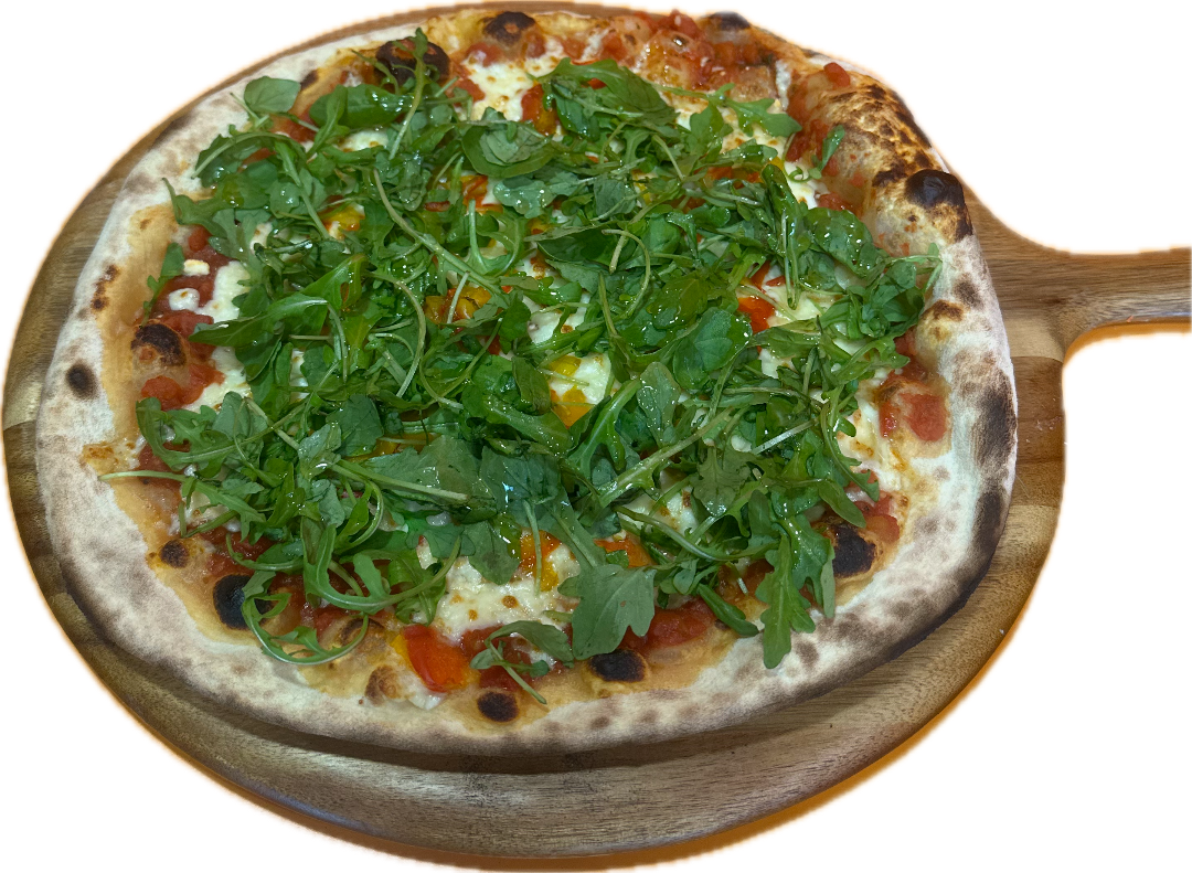 sauce tomate, mozzarella, chèvre, poivrons cuisinés, après cuisson : roquette + miel