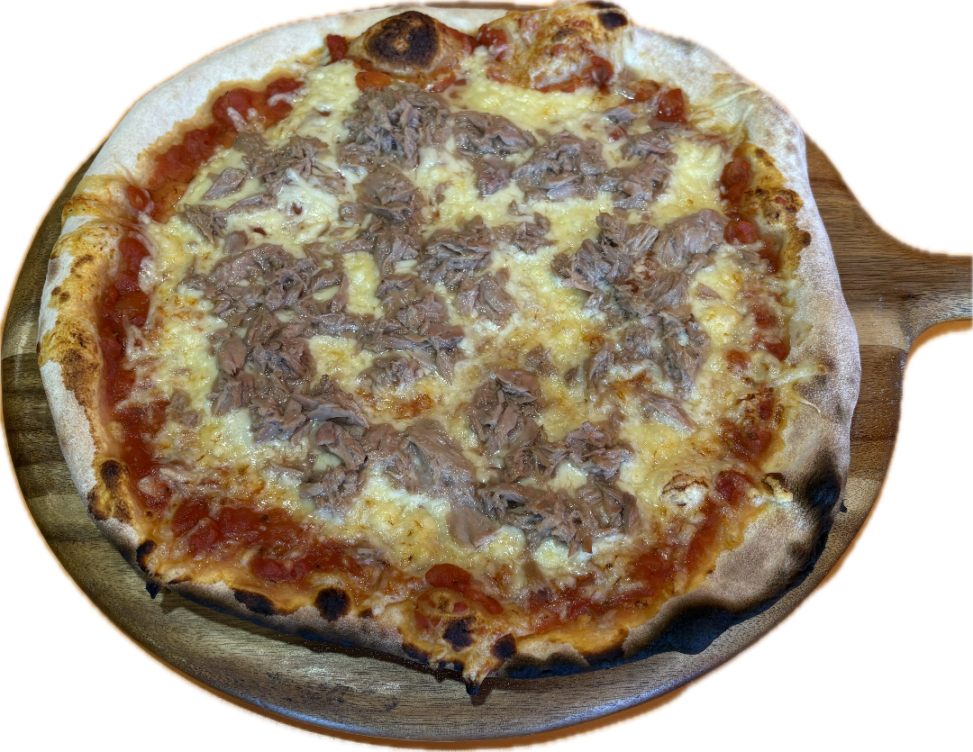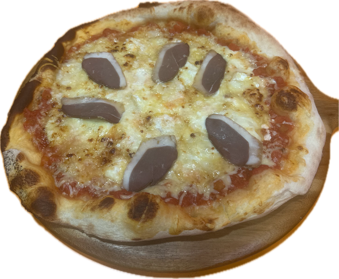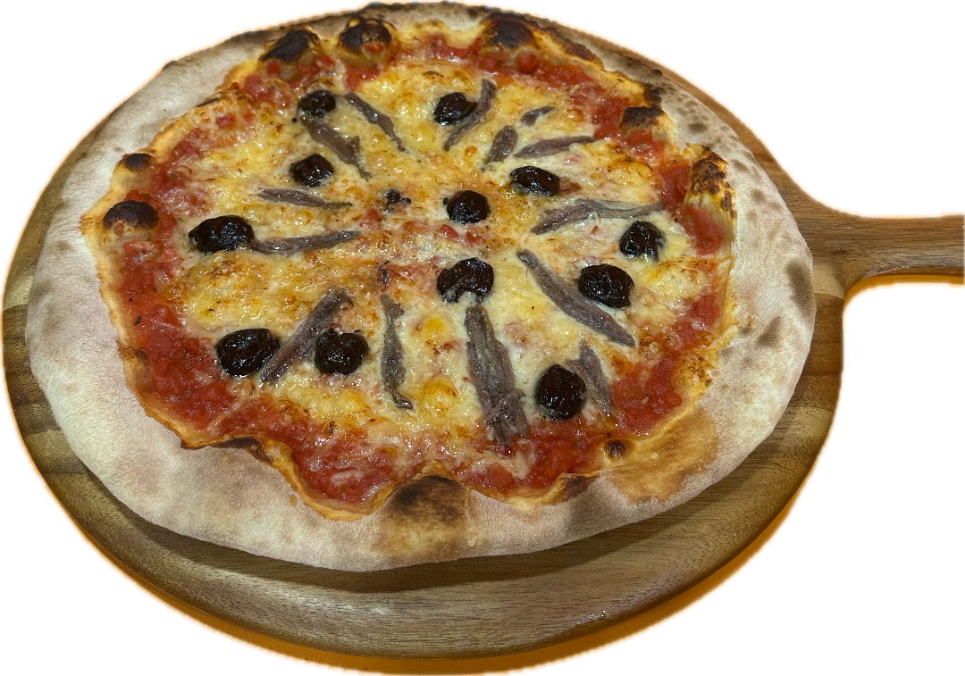sauce tomate, anchois, après cuisson : mozzarella di Bufala, feuilles de basilic, huile olive extra vierge