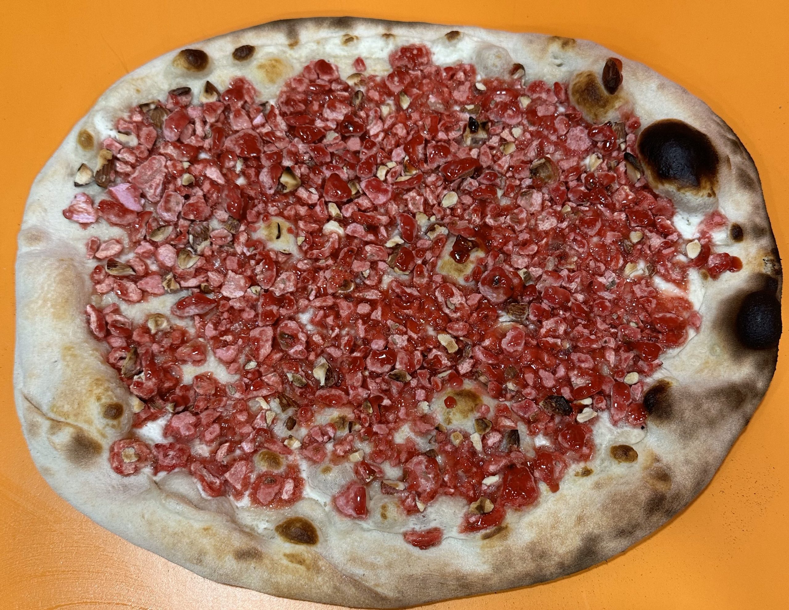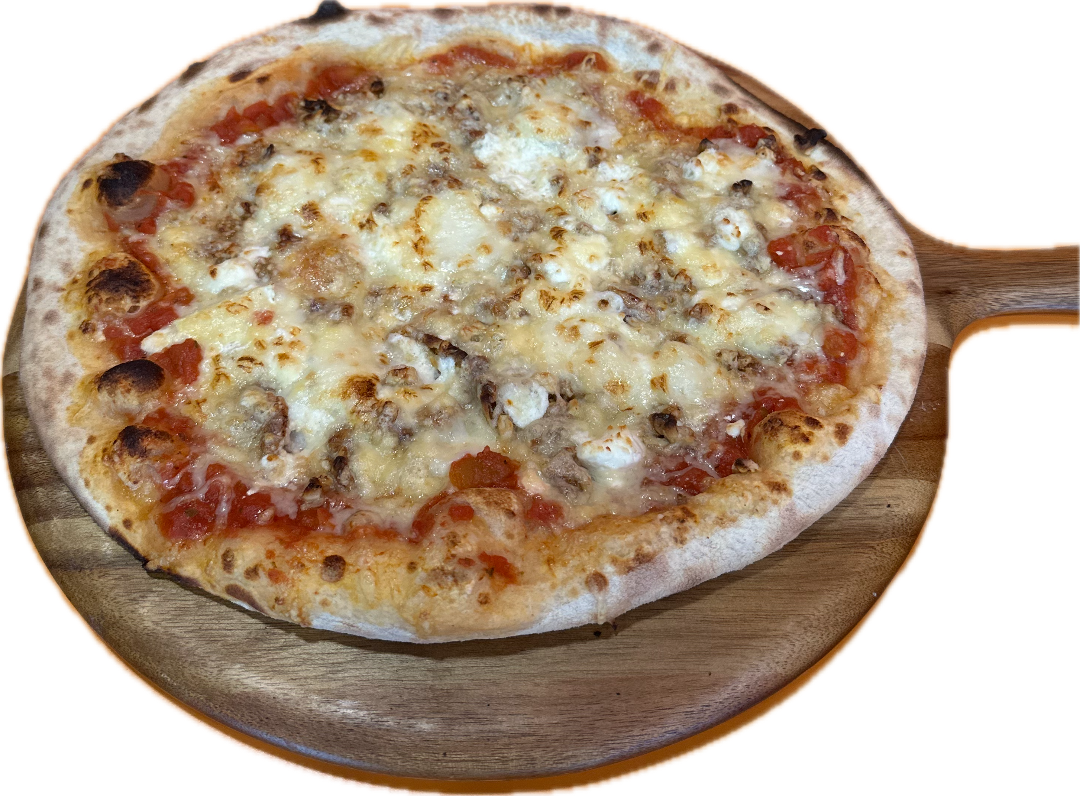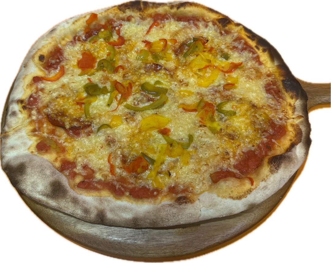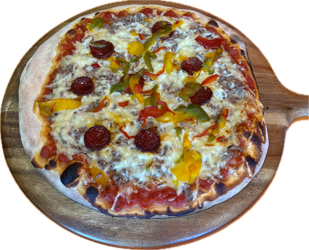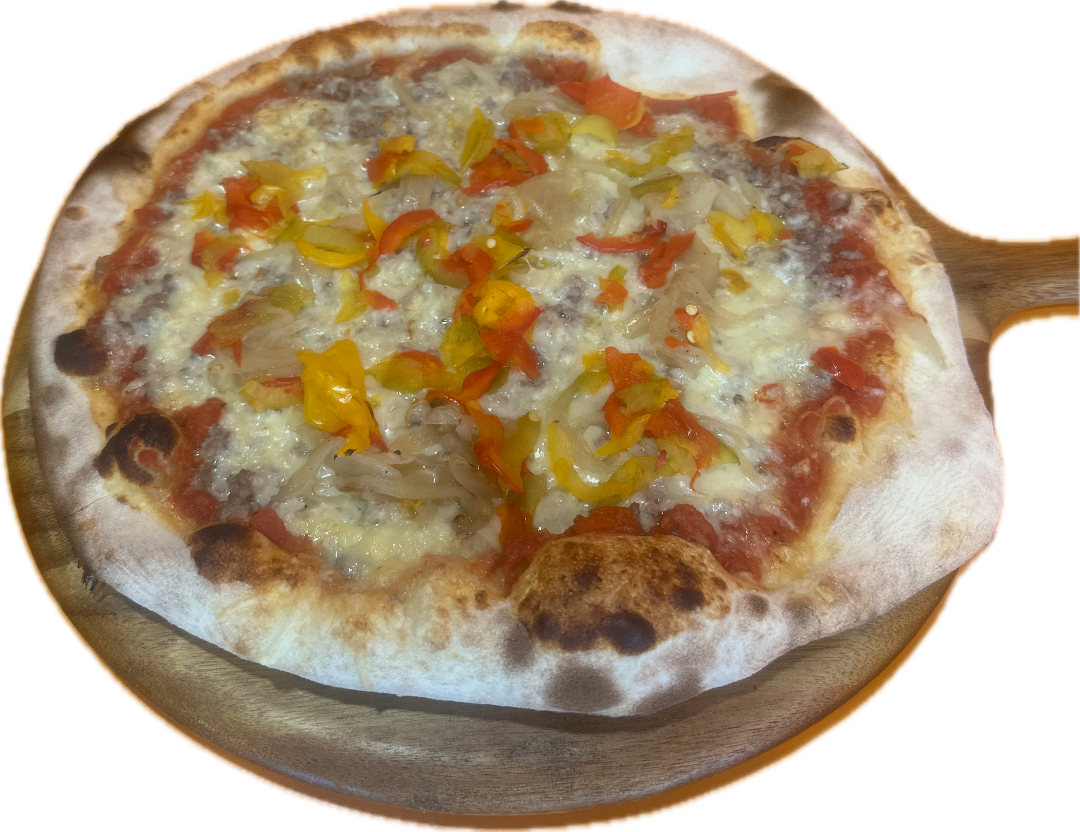 sauce tomate, emmental, boeuf haché, pepperonis, poivrons