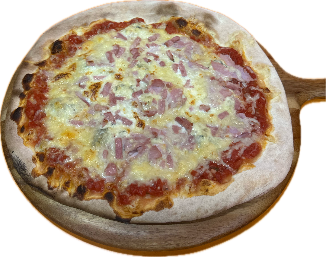 sauce tomate, emmental, épaule, lardons, bleu, crème