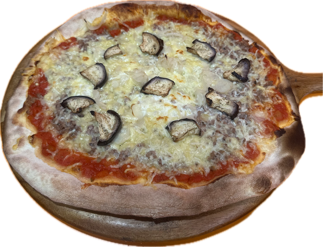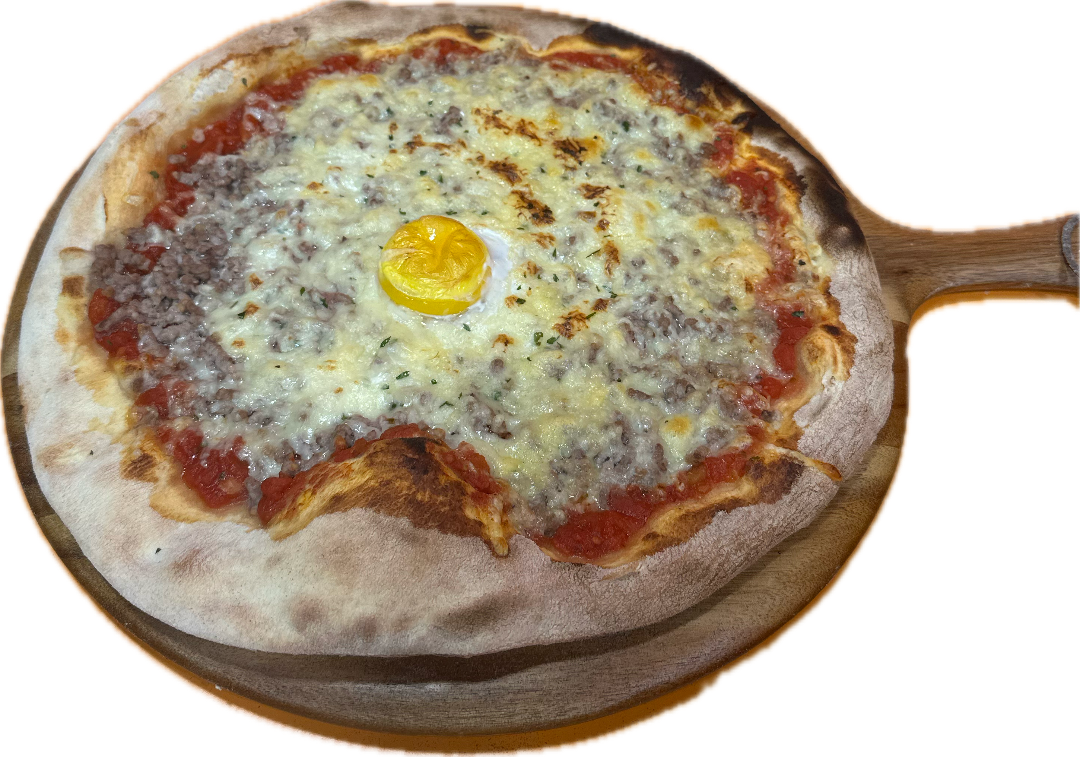 sauce tomate, emmental, boeuf haché épicé, oignons, poivrons