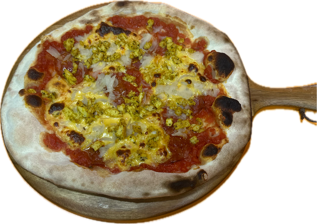 sauce tomate, poulet mariné, cheddar, chorizo, oignons