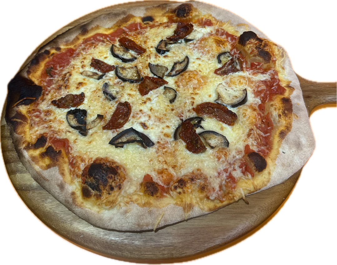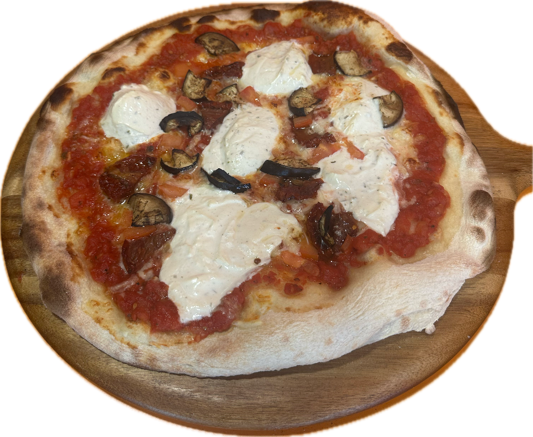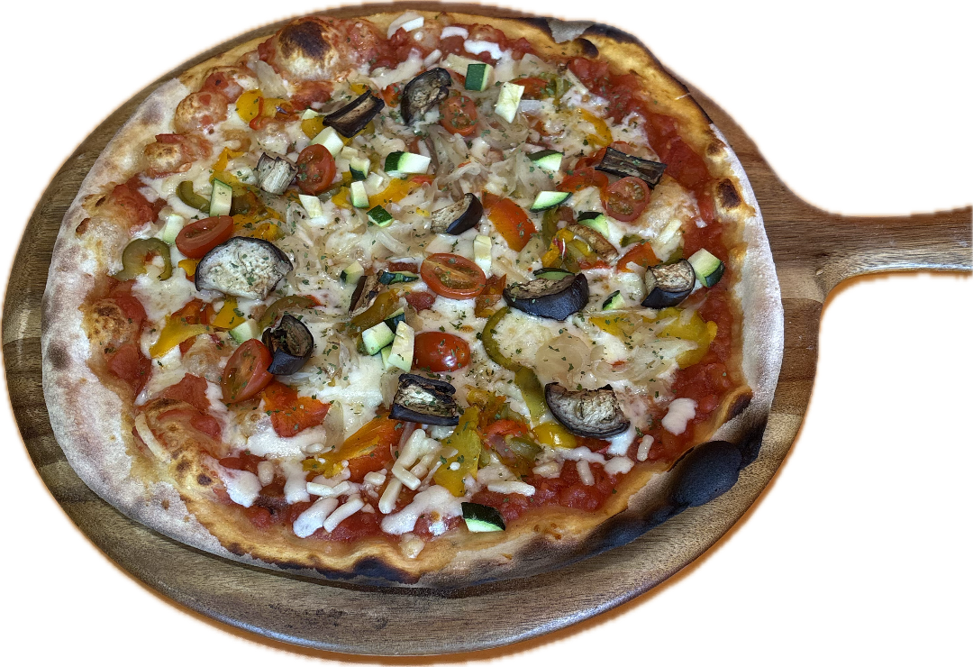 sauce tomate, mozzarella, aubergines, poivrons, oignons, tomates cerise, courgettes, persillade