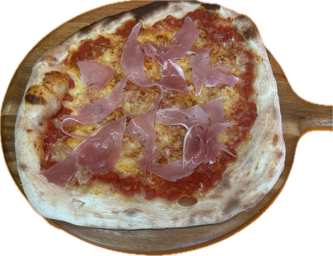 sauce tomate, tomates cerise, après cuisson : jambon de parme, mozzarella di Bufala, roquette, copeaux de parmesan, crème de balsamique