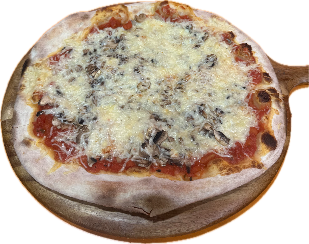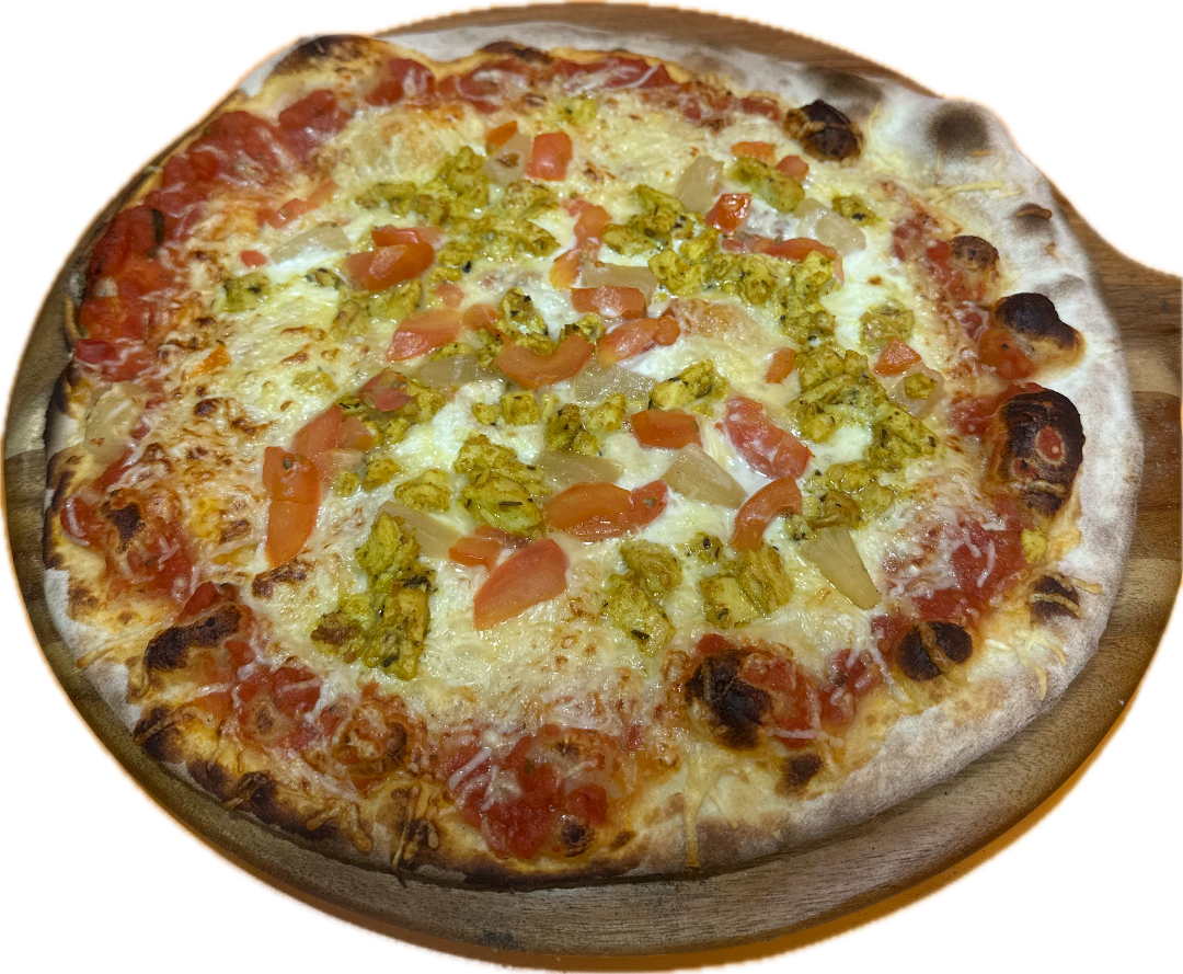 sauce tomate, emmental, poulet mariné, champignons frais, poivrons, crème